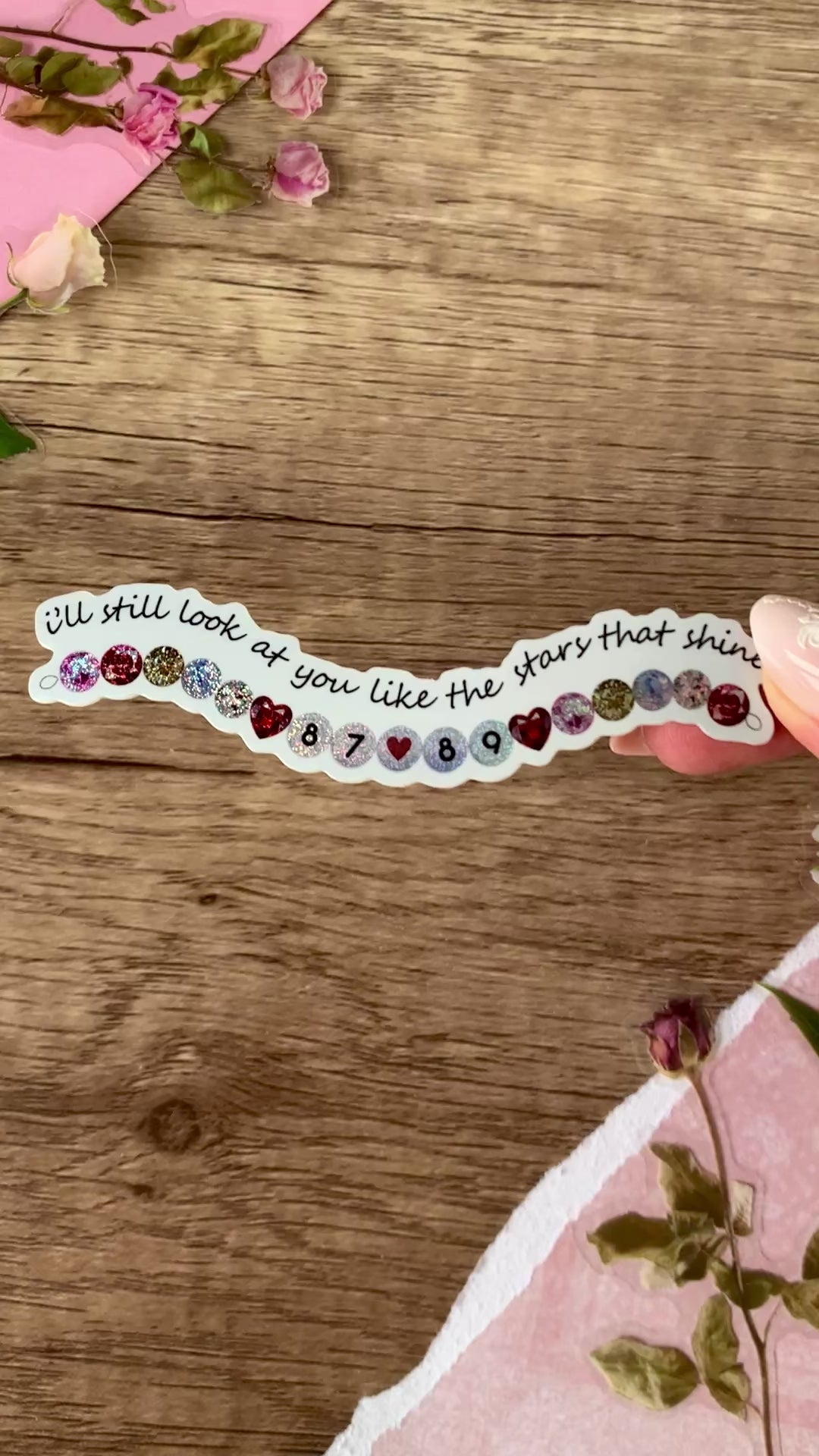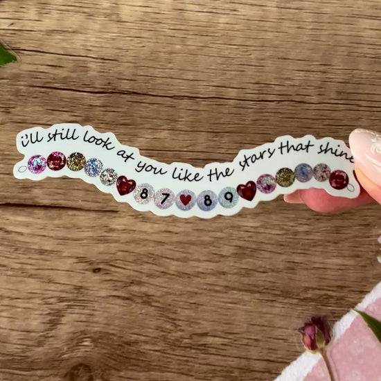 These beautiful bracelet stickers are a perfect way to remember your favorite song! The design features a beaded bracelet with 87 and 89 beads, just like the song lyric (and numbers representing Travis and Taylor!) A subtle shimmer effect makes them sparkle in the light! (Glitter is sealed by vinyl overlay, it will not transfer.) These stickers look great on a laptop, water bottle, phone case, or wherever makes you happy! These are glossy vinyl stickers, dimensions 3.9" x 1". Perfect for music lovers! Stickers are made to be waterproof, scratch-proof, weather-proof, and UV-resistant. They are also dishwasher safe. Wherever you put them, they should stay beautiful for years to come!