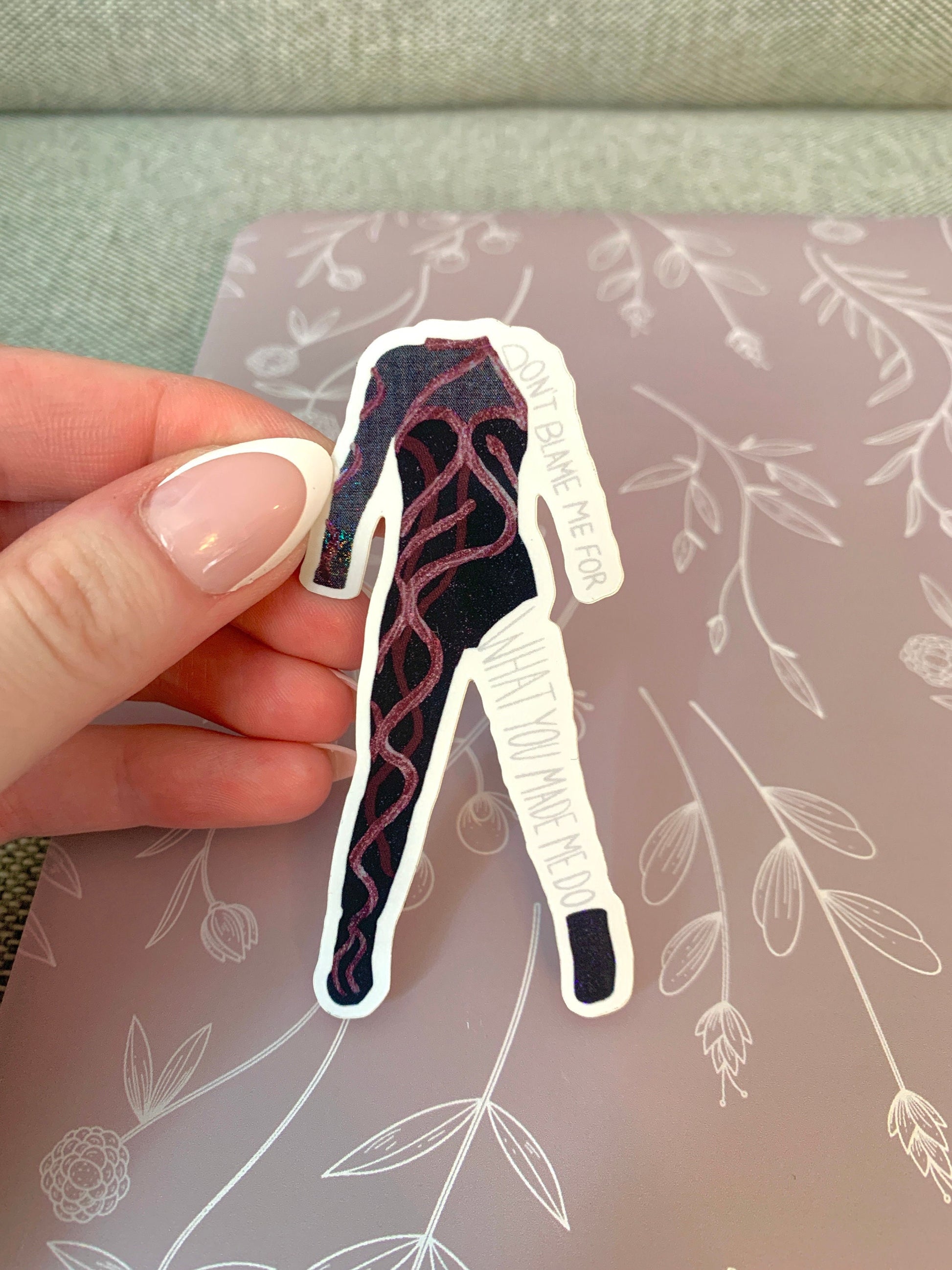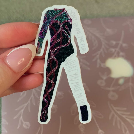 These shimmery Eras black and red snake outfit stickers shine bright with stunning detail! Featuring a one-sided bodysuit design overlaid with tiny sparkles, they shimmer with every color of light. (Glitter is sealed by vinyl overlay, it will not transfer.) These stickers look great on a laptop, water bottle, phone case, or wherever makes you happy! These are glossy vinyl stickers, dimensions 1.5" x 3.1". Perfect for music lovers! Stickers are made to be scratch-proof, weather-proof, and UV-resistant. Wherever you put them, they should stay beautiful for years to come!