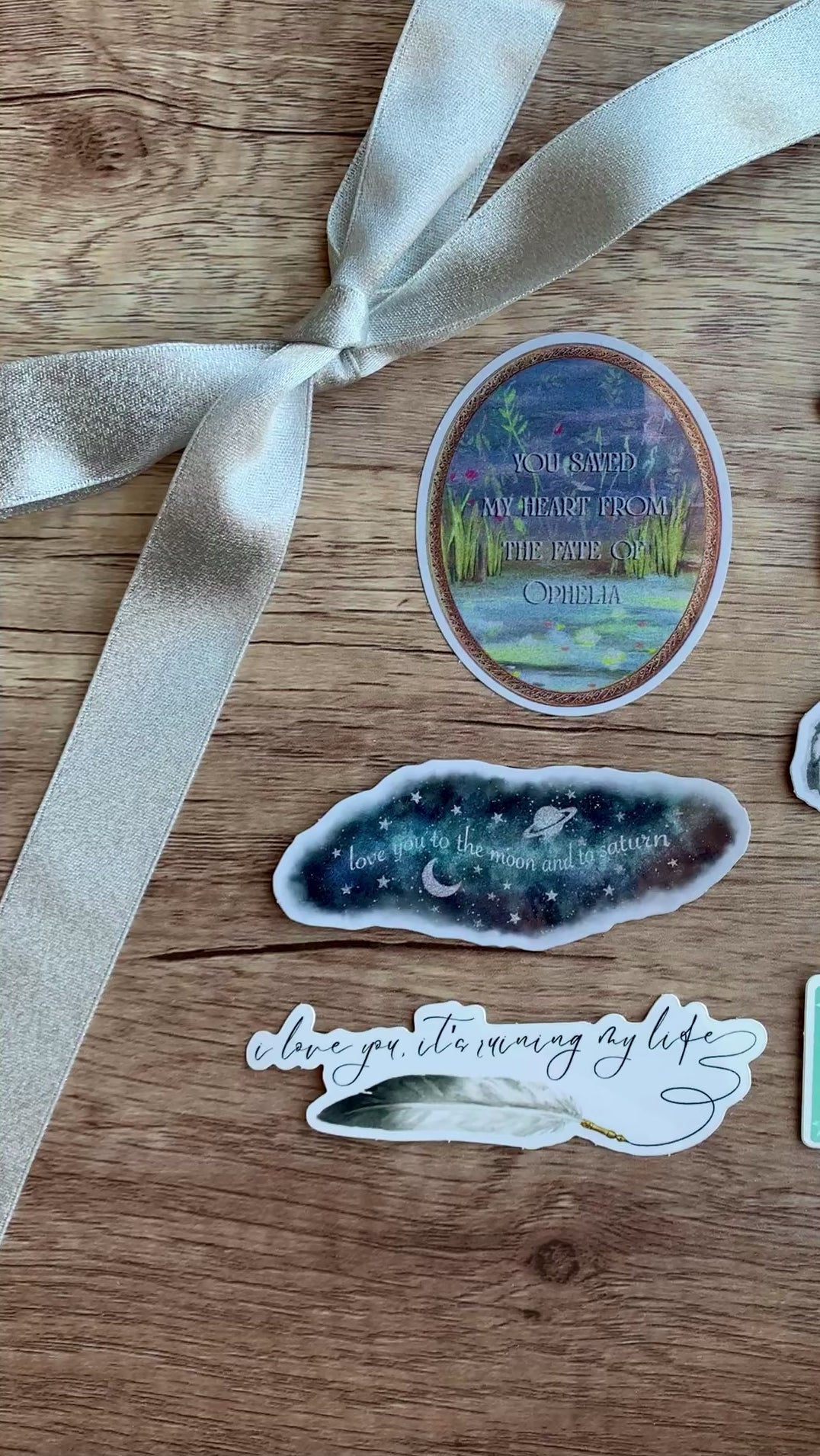 The perfect gift for a literature and lyric lover! This bundle collection includes 6 stunning stickers: Ophelia Painting, Poets Variants Books, Moon and Saturn, Hold on to the Memories Scrapbook, Fountain Pen and Track 5s as Books! These stickers look great on a laptop, water bottle, phone case, or wherever makes you happy! Perfect for music lovers. Stickers are made to be scratch-proof, weather-proof, and UV-resistant. Wherever you put them, they should stay beautiful for years to come!