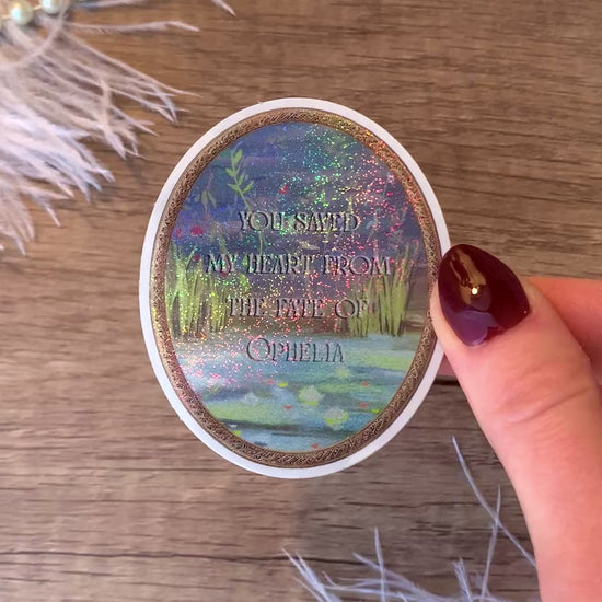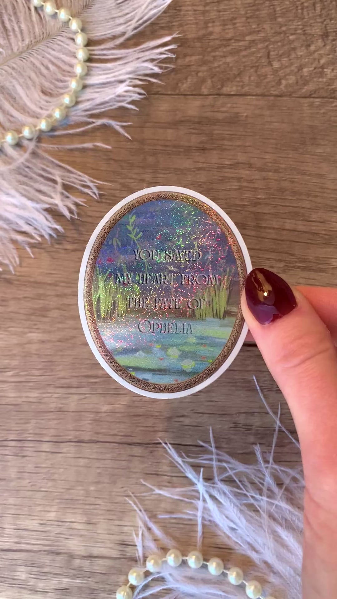These gorgeous Ophelia-inspired painting stickers are the perfect way to remember your favorite song! The design features a gold framed acrylic painting adorned with magical shimmers. A subtle watercolor lyric softly whispers in the light! (Glitter is sealed by vinyl overlay, it will not transfer.) These stickers look great on a laptop, water bottle, phone case, or wherever makes you happy! These are glossy vinyl stickers, dimensions 2.2" x 2.7". Perfect for music lovers! Stickers are made to be waterproof, scratch-proof, weather-proof, and UV-resistant. They are also dishwasher safe. Wherever you put them, they should stay beautiful for years to come!
