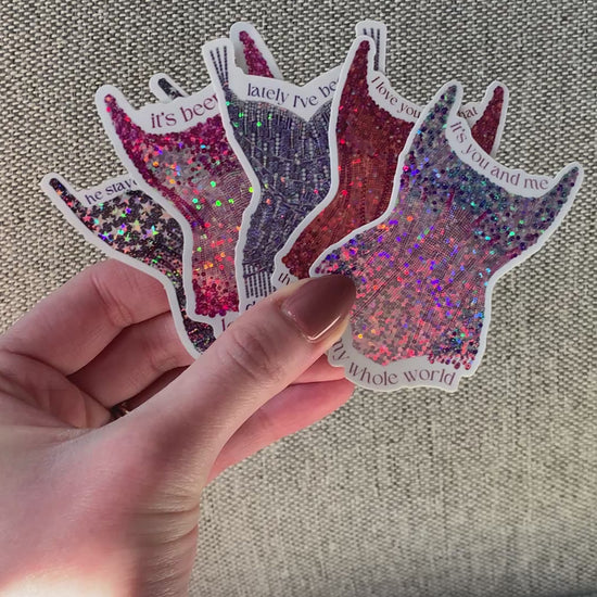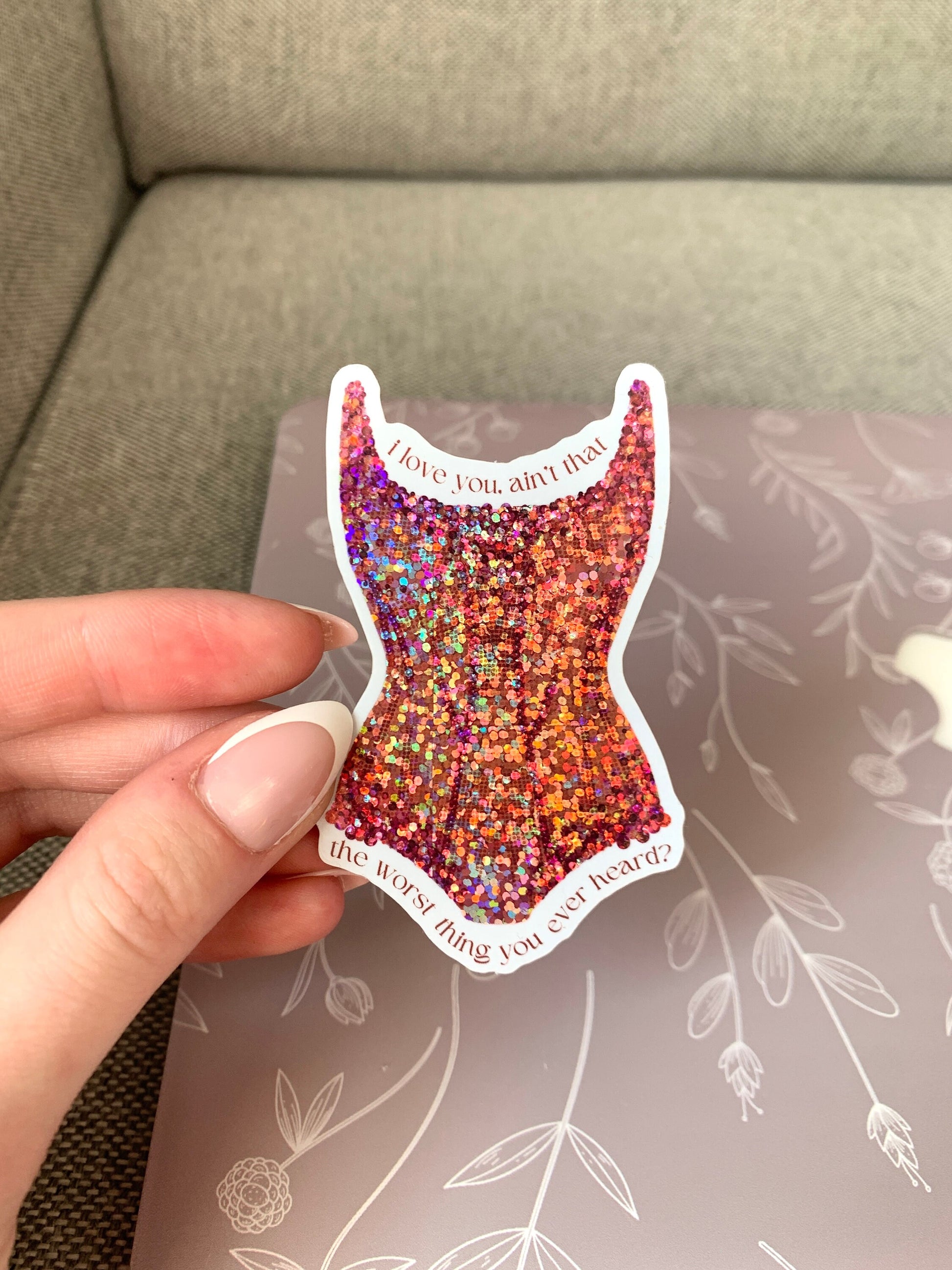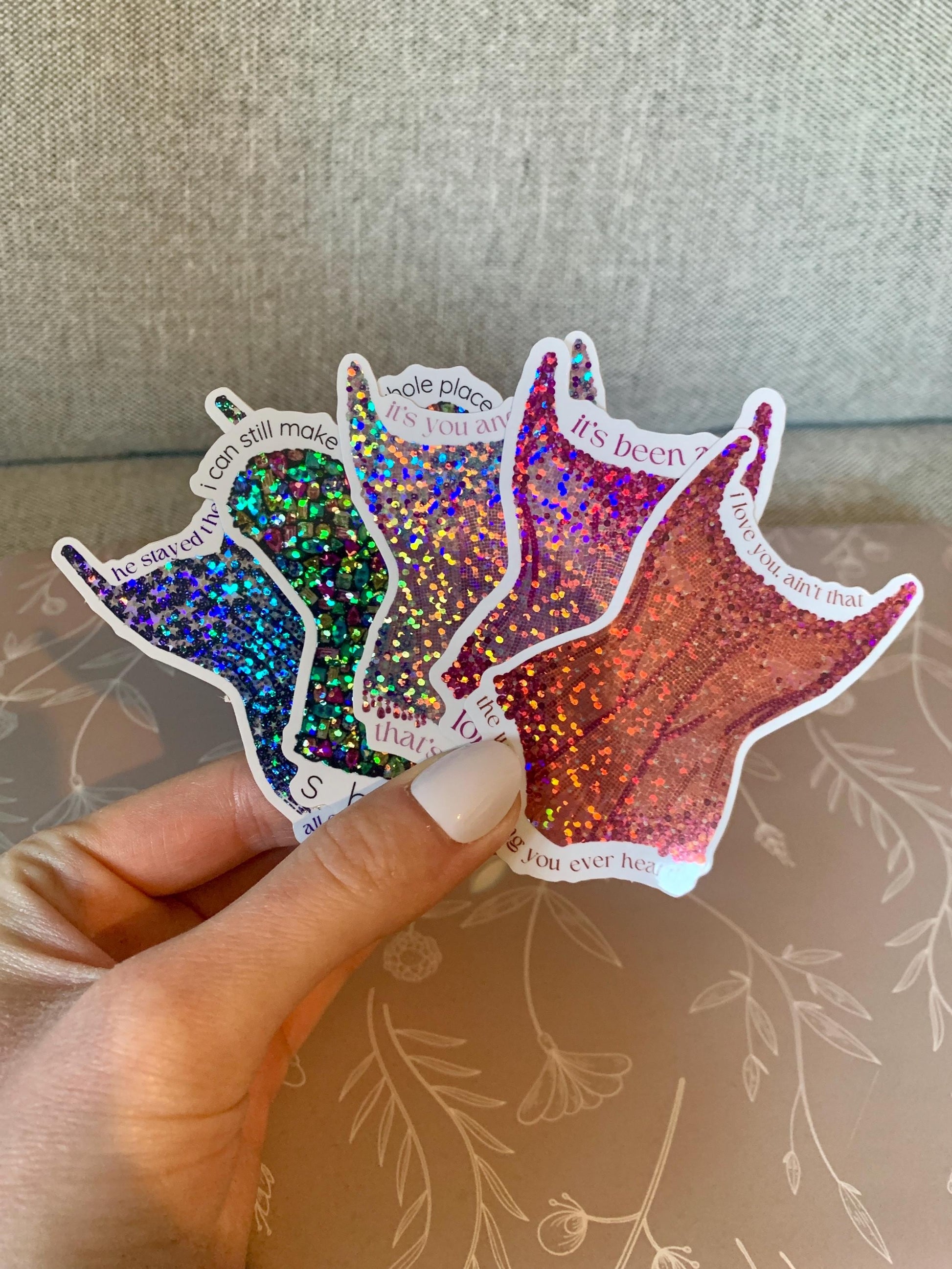 Bundle includes five sparkly Eras bodysuit stickers: It's You and Me pink and blue sticker, It’s Been a Long Time pink sticker, Midnights Moon & Stars sticker, Bejeweled sticker, and Tangerine Orange bodysuit sticker. (Glitter is sealed by vinyl overlay, it will not transfer.) These stickers look great on a laptop, water bottle, phone case, or wherever makes you happy! These are glossy vinyl stickers, dimensions 1.9" x 3". Perfect for music lovers! Stickers are made to be scratch-proof, weather-proof, and UV-resistant. Wherever you put them, they should stay beautiful for years to come!