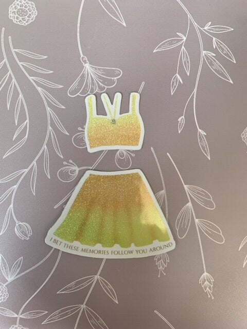 These shimmery Eras colorful top and skirt sets shine bright with stunning detail! This bundle includes every top and skirt sticker, for a total of 12 stickers total to mix and match!. Each set features a flowing circle skirt and matching top design. Overlaid with tiny sparkles, they shimmer with every color of light. (Glitter is sealed by vinyl overlay, it will not transfer.) These stickers look great on a laptop, water bottle, phone case, or wherever makes you happy! These are glossy vinyl stickers, top dimensions 1" x 1", skirt dimensions 2.3" x 1.6". Perfect for music lovers! Stickers are made to be scratch-proof, weather-proof, and UV-resistant. Wherever you put them, they should stay beautiful for years to come!