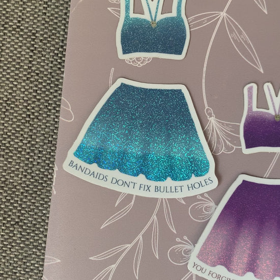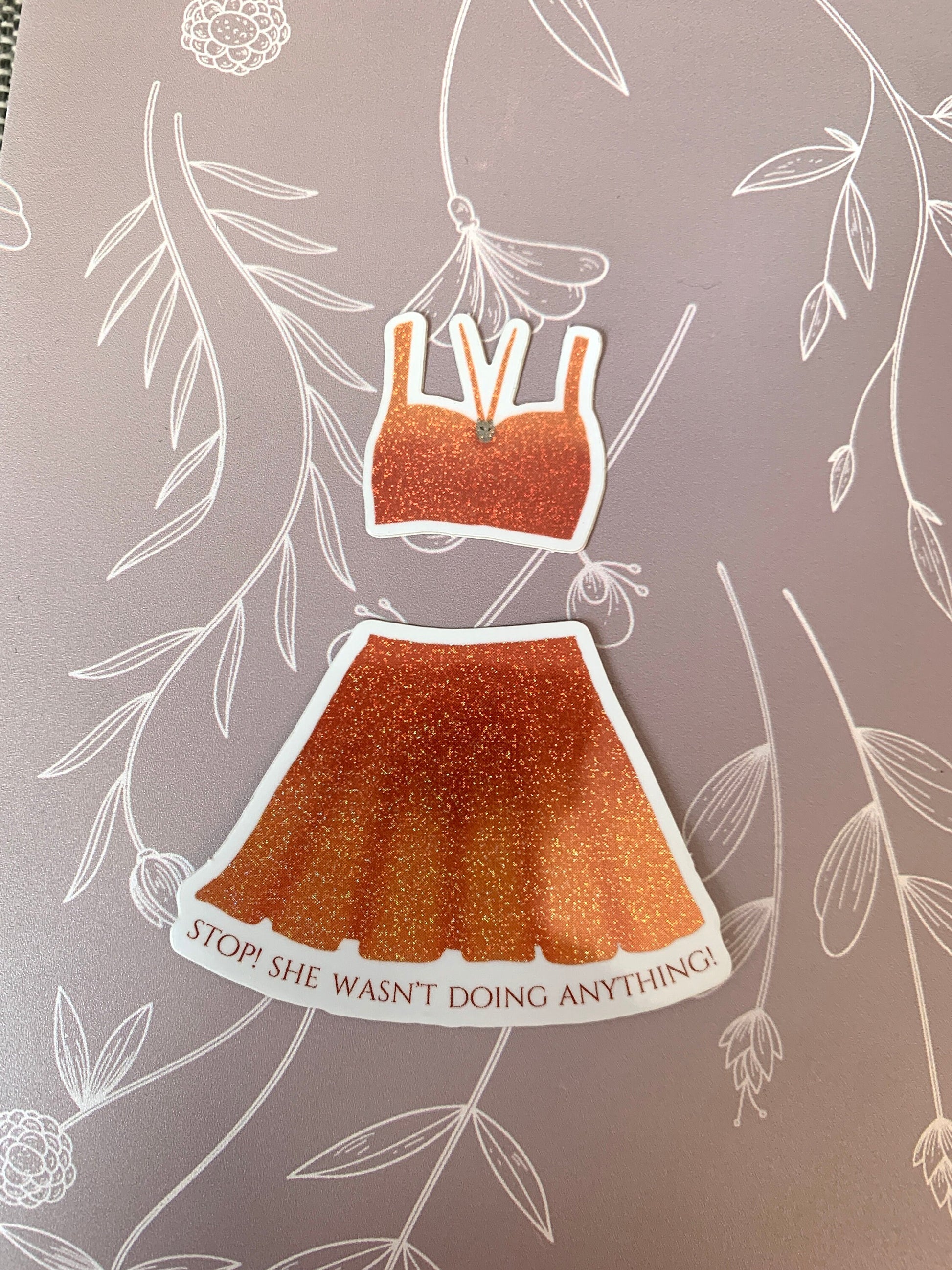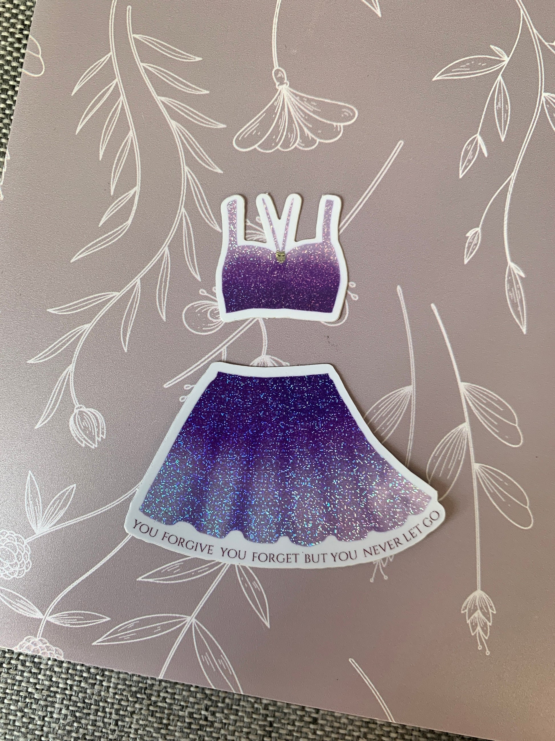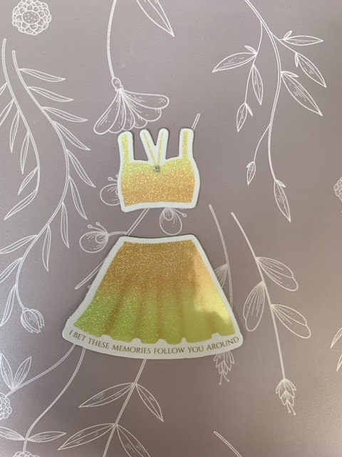These shimmery Eras colorful top and skirt sets shine bright with stunning detail! (This listing includes one top and one skirt sticker, choose your colors below). Each set features a flowing circle skirt and matching top design. Overlaid with tiny sparkles, they shimmer with every color of light. (Glitter is sealed by vinyl overlay, it will not transfer.) These stickers look great on a laptop, water bottle, phone case, or wherever makes you happy! These are glossy vinyl stickers, top dimensions 1" x 1", skirt dimensions 2.3" x 1.6". Perfect for music lovers! Stickers are made to be scratch-proof, weather-proof, and UV-resistant. Wherever you put them, they should stay beautiful for years to come!