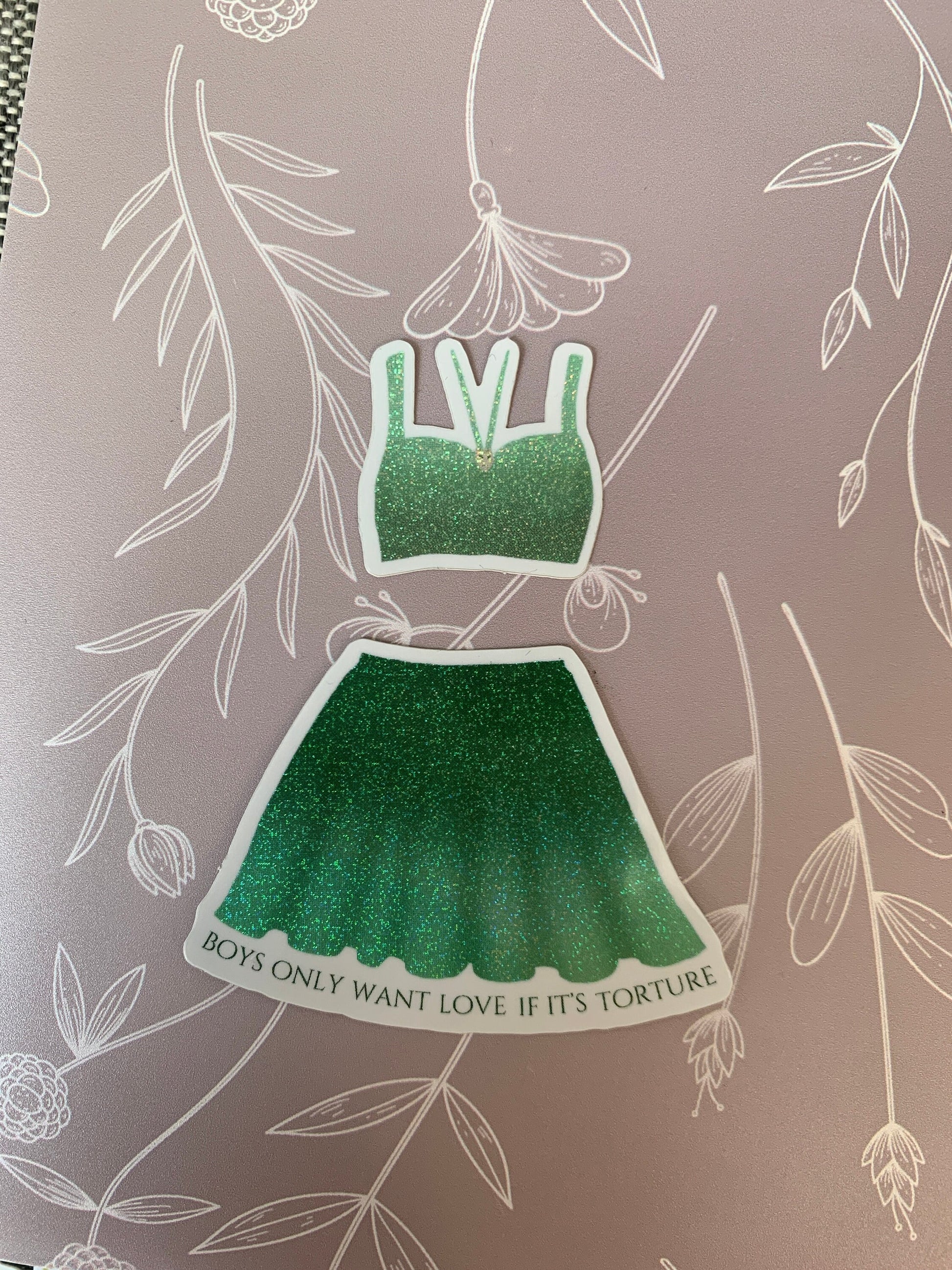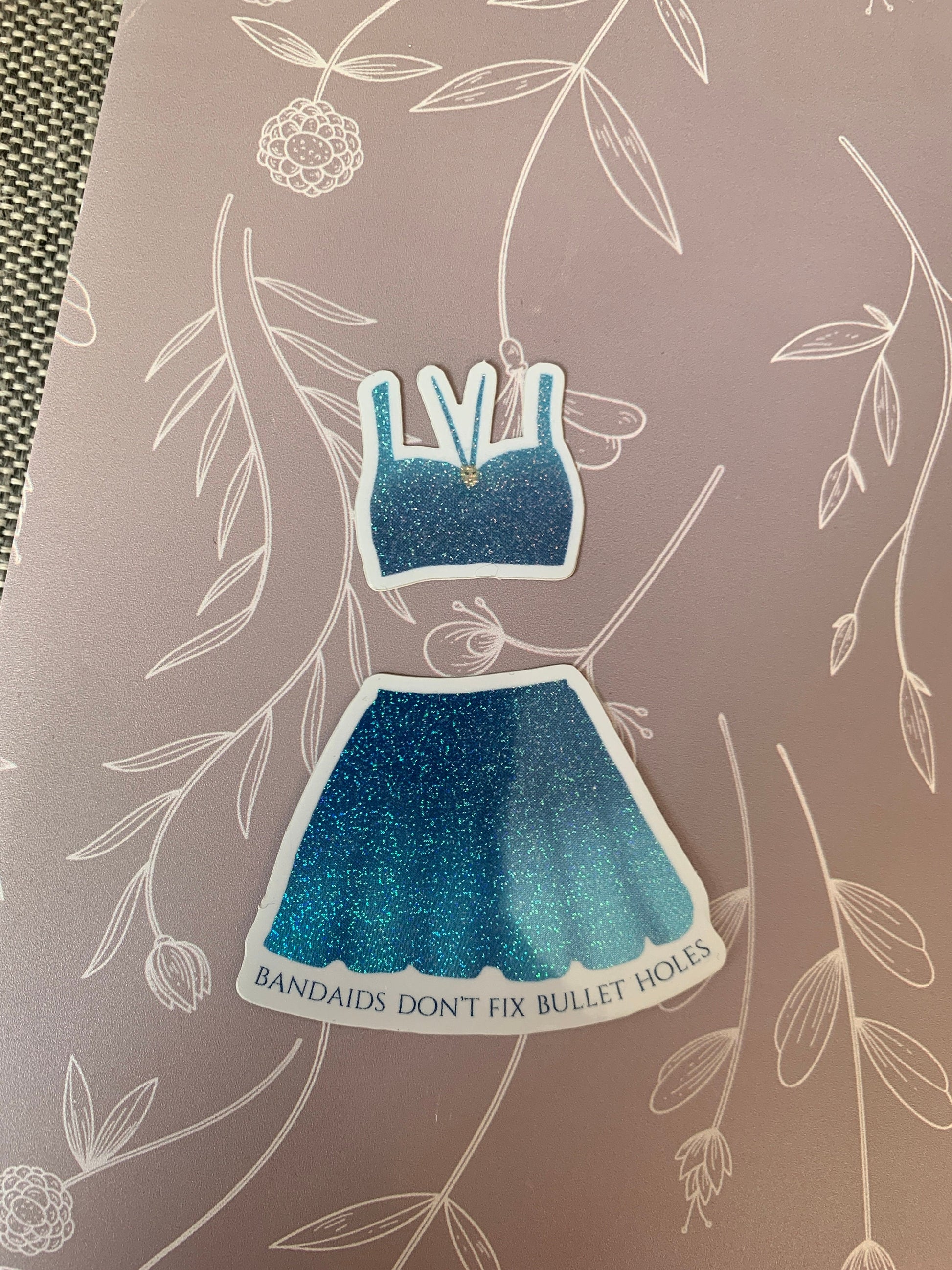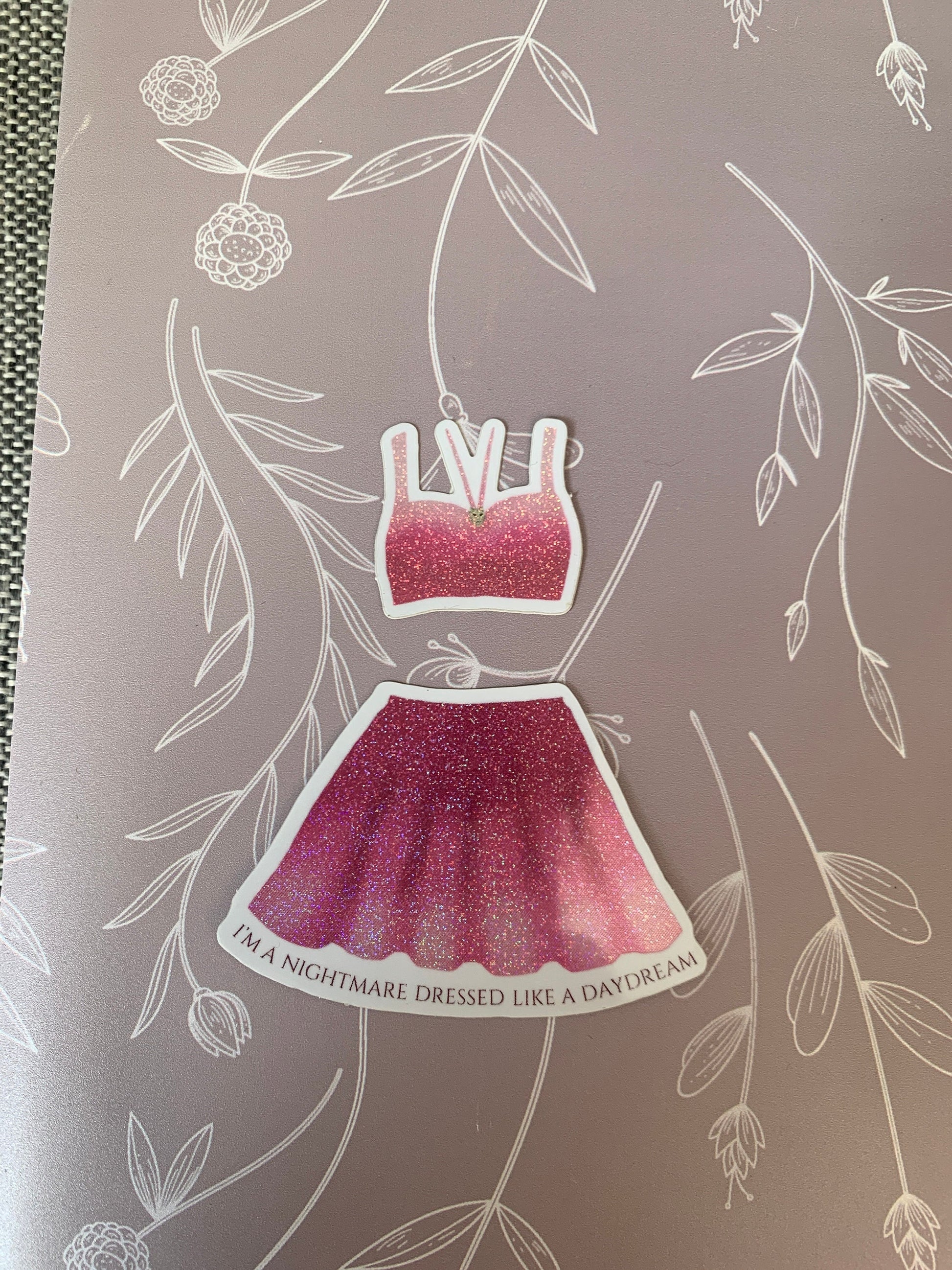 These shimmery Eras colorful top and skirt sets shine bright with stunning detail! (This listing includes one top and one skirt sticker, choose your colors below). Each set features a flowing circle skirt and matching top design. Overlaid with tiny sparkles, they shimmer with every color of light. (Glitter is sealed by vinyl overlay, it will not transfer.) These stickers look great on a laptop, water bottle, phone case, or wherever makes you happy! These are glossy vinyl stickers, top dimensions 1" x 1", skirt dimensions 2.3" x 1.6". Perfect for music lovers! Stickers are made to be scratch-proof, weather-proof, and UV-resistant. Wherever you put them, they should stay beautiful for years to come!