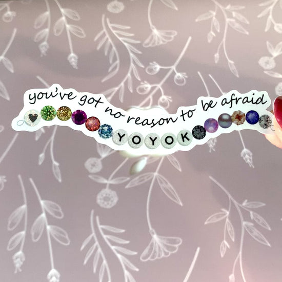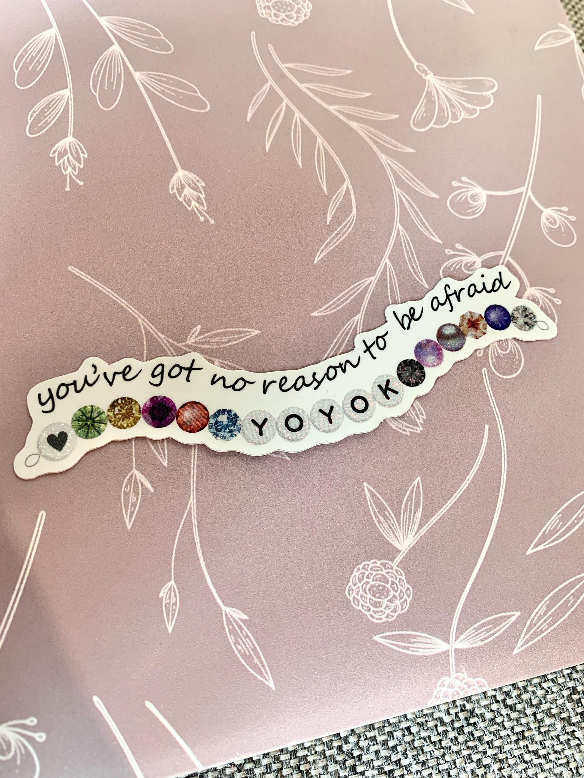 These beautiful shimmery friendship bracelet stickers are the perfect way to commemorate your special concert memories! The design features a beaded bracelet (one bead color for each era, in order) framing letter beads spelling "YOYOK". (Glitter is sealed by vinyl overlay, it will not transfer.) These stickers look great on a laptop, water bottle, phone case, or wherever makes you happy! These are glossy vinyl stickers, dimensions 3.9" x 1". Perfect for music lovers! Stickers are made to be waterproof, scratch-proof, weather-proof, and UV-resistant. They are also dishwasher safe. Wherever you put them, they should stay beautiful for years to come!