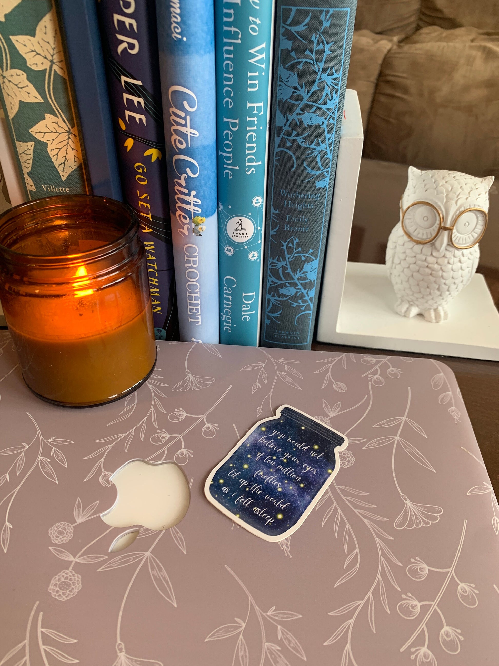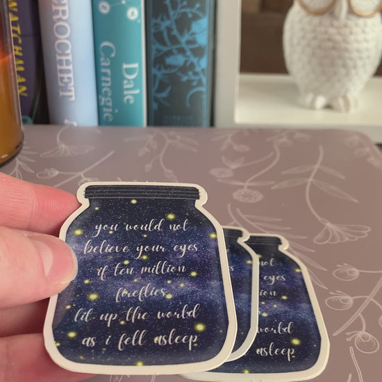 These beautiful fireflies jar stickers look great on a laptop, water bottle, phone case, or wherever makes you happy! These are glossy vinyl stickers, dimensions 1.9" x 2.8". Features a clear mason jar design with song lyrics, glowing fireflies and a dreamy blue galaxy background. Perfect for music lovers! Stickers are made to be scratch-proof, weather-proof, and UV-resistant. Wherever you put them, they should stay beautiful for years to come!