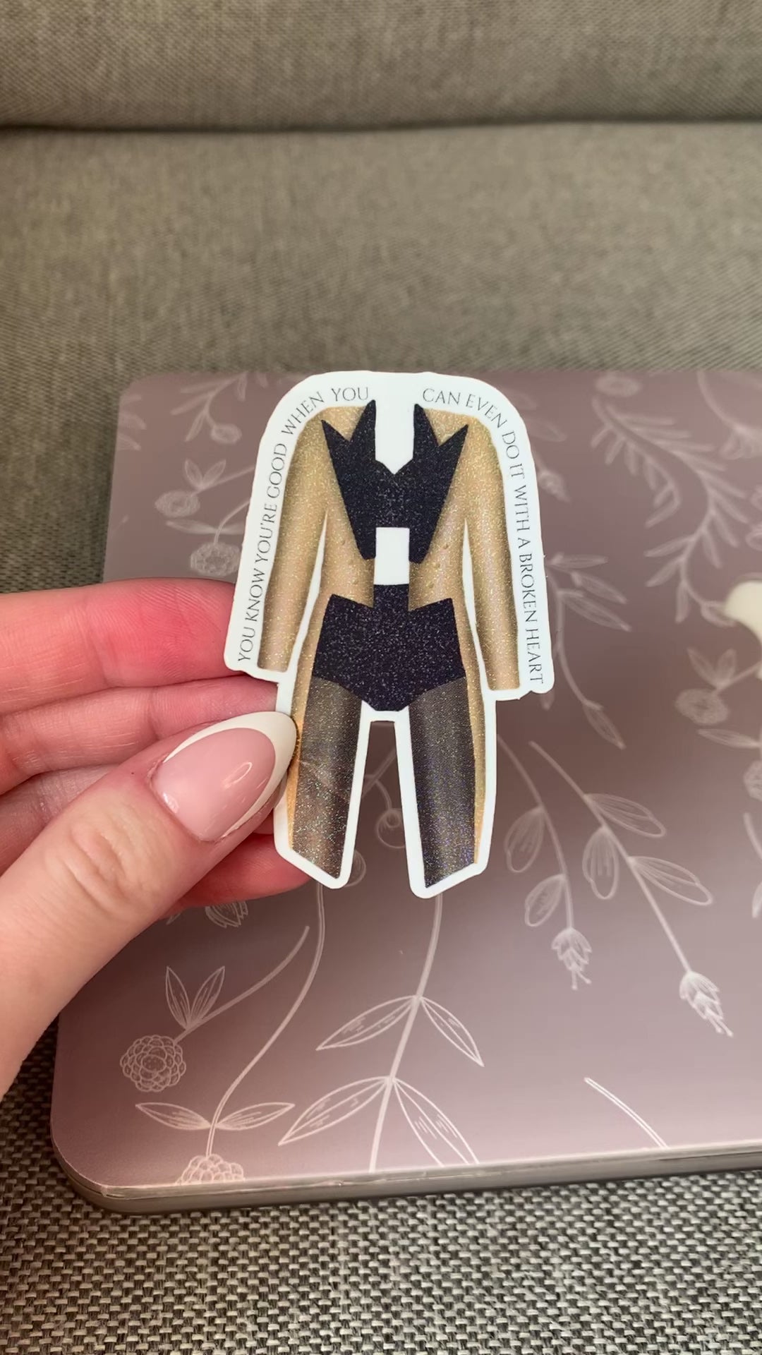 These shimmery Eras gold jacket outfit stickers shine bright with stunning detail! Featuring a shiny gold and black coat design overlaid with tiny sparkles, they shimmer with every color of light. (Glitter is sealed by vinyl overlay, it will not transfer.) These stickers look great on a laptop, water bottle, phone case, or wherever makes you happy! These are glossy vinyl stickers, dimensions 1.9" x 2.9". Perfect for music lovers! Stickers are made to be scratch-proof, weather-proof, and UV-resistant. Wherever you put them, they should stay beautiful for years to come!