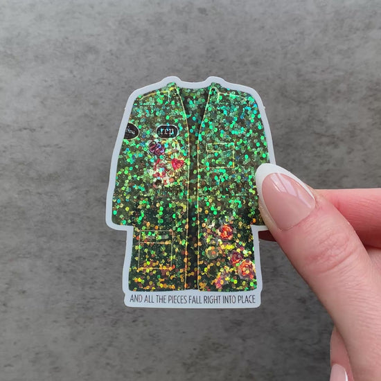 These sequined green patch jacket stickers will take you right back to your favorite tour moments! The design features a forest green jacket with gold trim and detailed, embroidered patches to match Taylor's perfectly. A sequin glitter effect makes them sparkle with every color of light! (Glitter is sealed by vinyl overlay, it will not transfer.)These stickers look great on a laptop, water bottle, phone case, or wherever makes you happy! These are glossy vinyl stickers, dimensions 2.1" x 2.8". Perfect for music lovers! Stickers are made to be waterproof, scratch-proof, weather-proof, and UV-resistant. They are also dishwasher safe. Wherever you put them, they should stay beautiful for years to come!