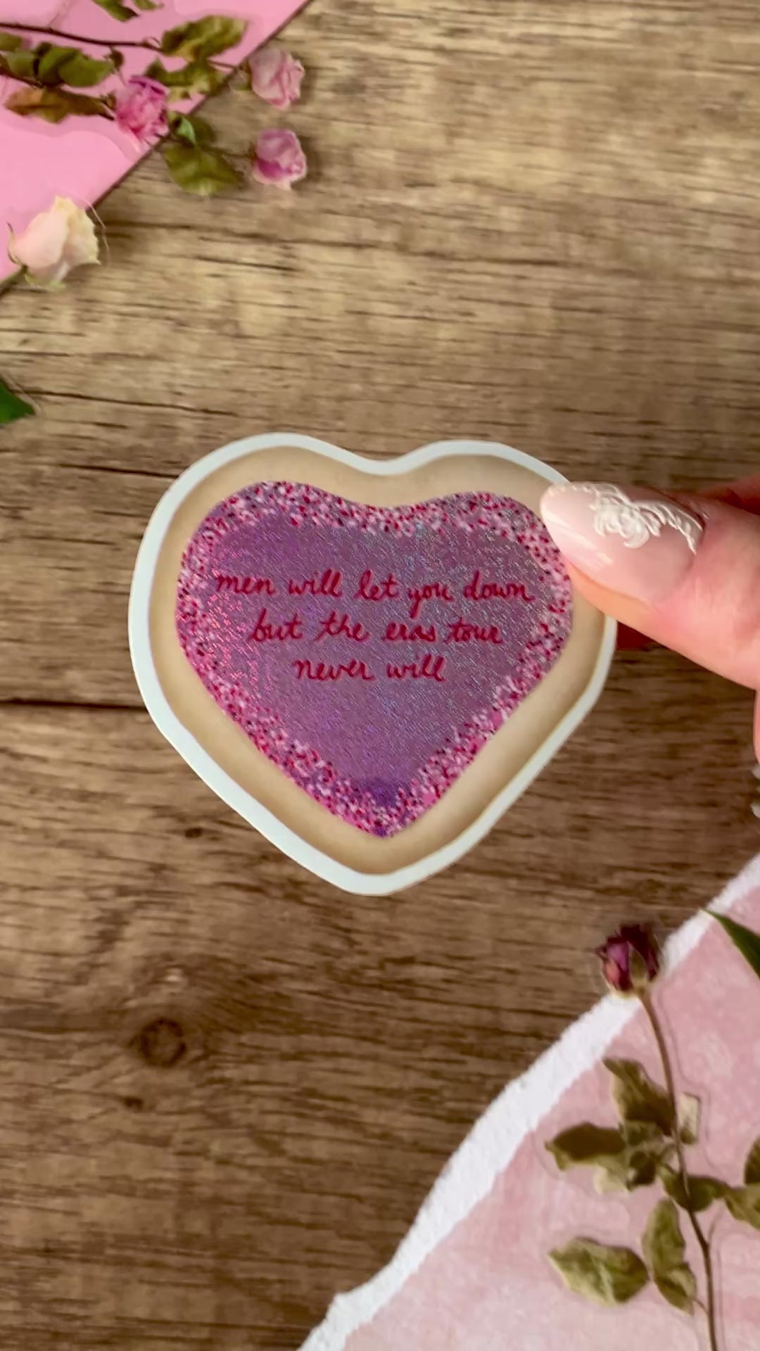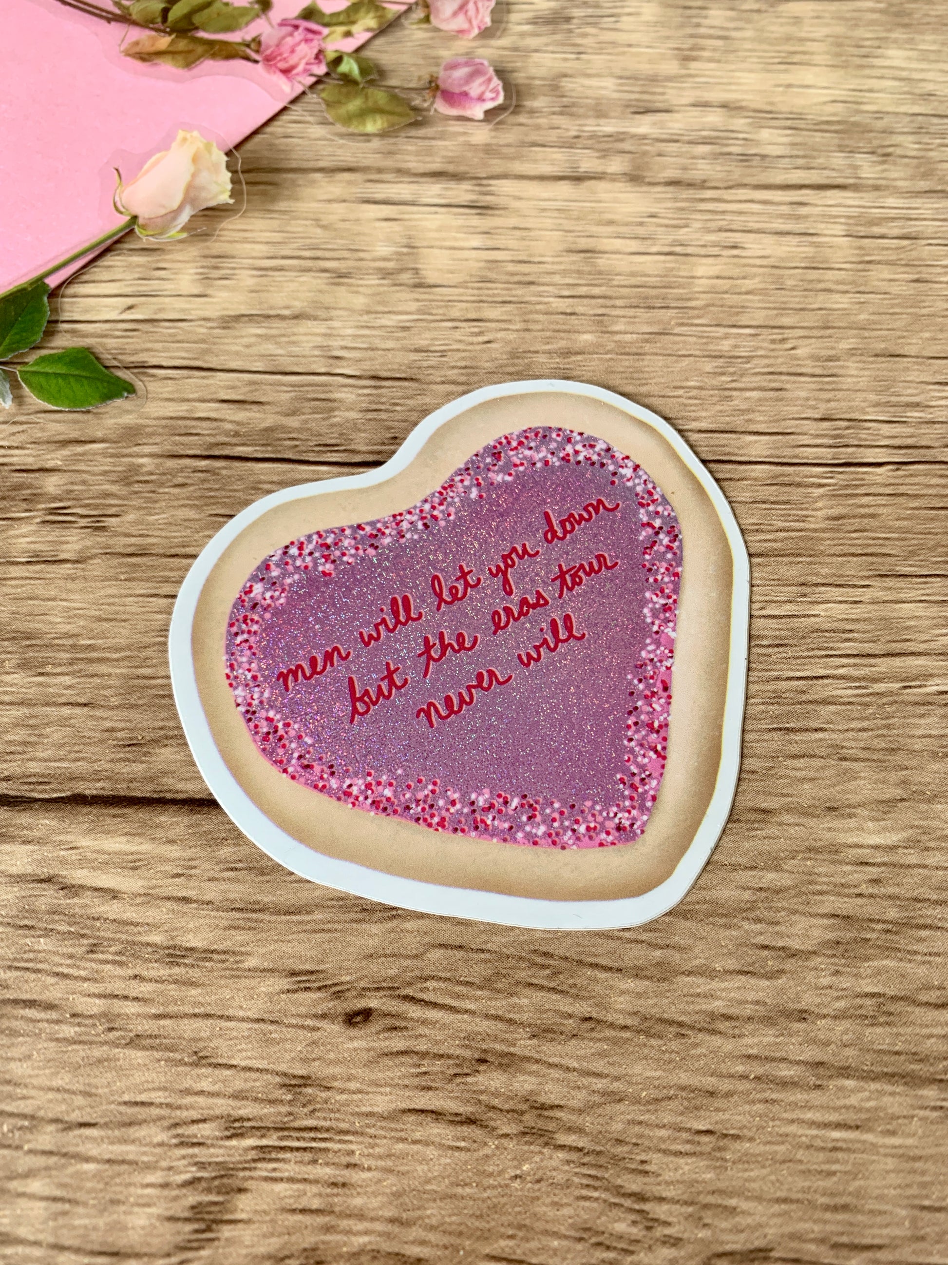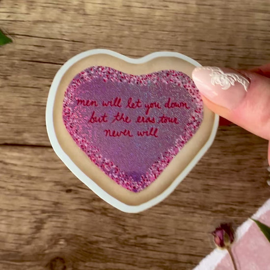 These stunning heart cookie stickers feature an iconic quote from Taylor (if you know, you know!) A subtle shimmer effect on the frosting makes them sparkle in the light! (Glitter is sealed by vinyl overlay, it will not transfer.) These stickers look great on a laptop, water bottle, phone case, or wherever makes you happy! These are glossy vinyl stickers, dimensions 2.5" x 2.4". Perfect for music lovers! Stickers are made to be waterproof, scratch-proof, weather-proof, and UV-resistant. They are also dishwasher safe. Wherever you put them, they should stay beautiful for years to come!