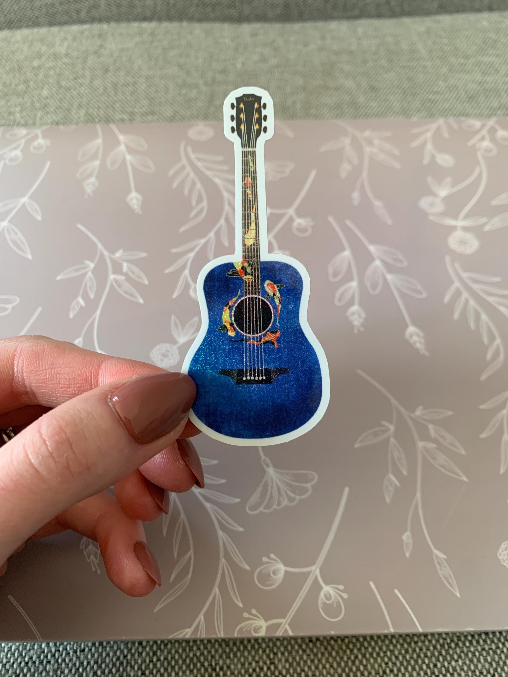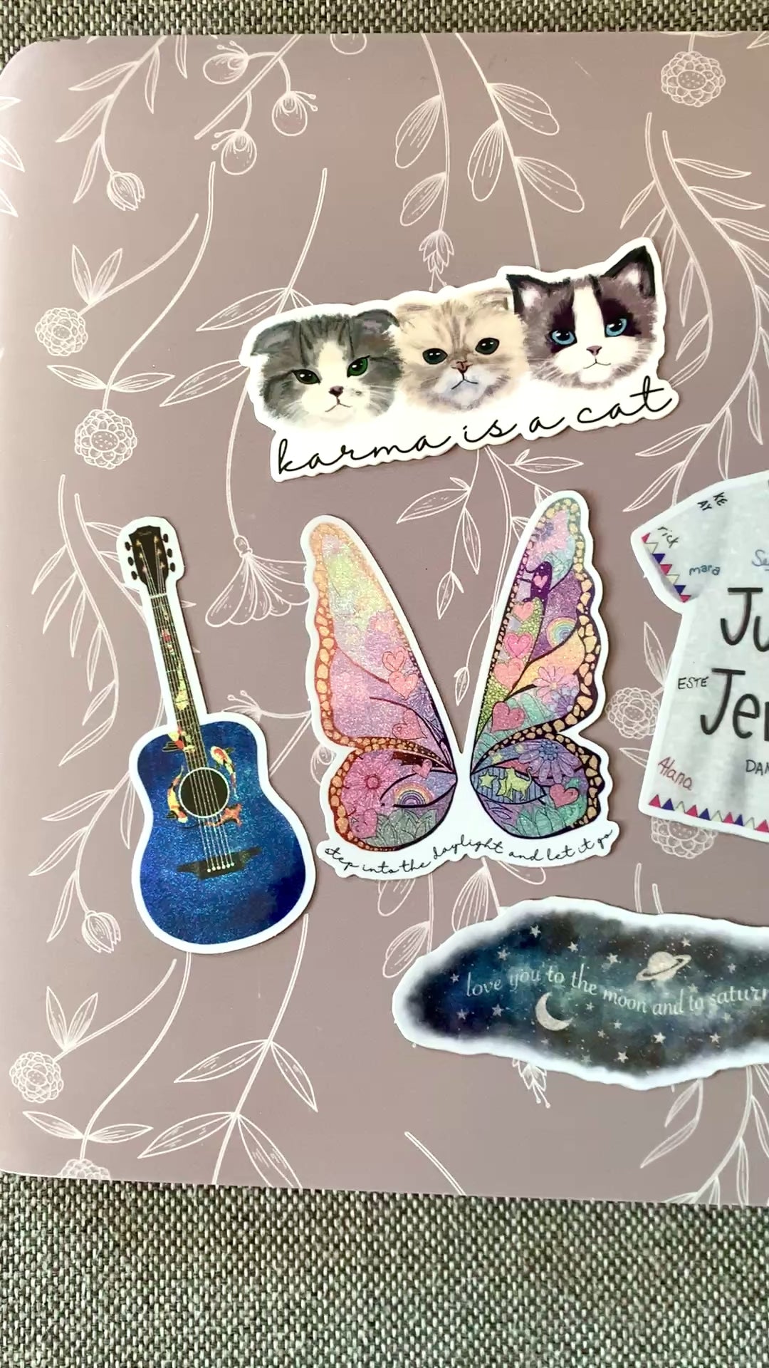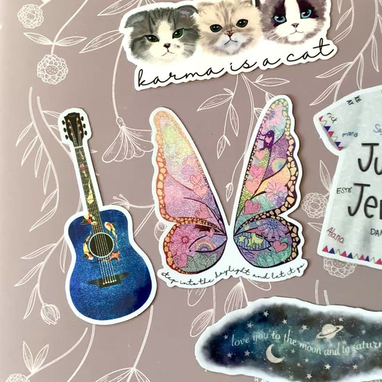 This bundle collection includes 8 stunning stickers: Taylor's Cats, Koi Guitar, Junior Jewels shirt, Polaroid frame, Butterfly Mural, Love you to the Moon Galaxy, Shimmery Snake and Hold on to the Memories Lyric Scrapbook. Each sticker features intricate detail and a subtle shimmer that makes them extra special! Please note: one Taylor's Cats sticker is included, please make your selection in the drop-down box. These stickers look great on a laptop, water bottle, phone case, or wherever makes you happy! Perfect for music lovers! Stickers are made to be scratch-proof, weather-proof, and UV-resistant. Wherever you put them, they should stay beautiful for years to come!