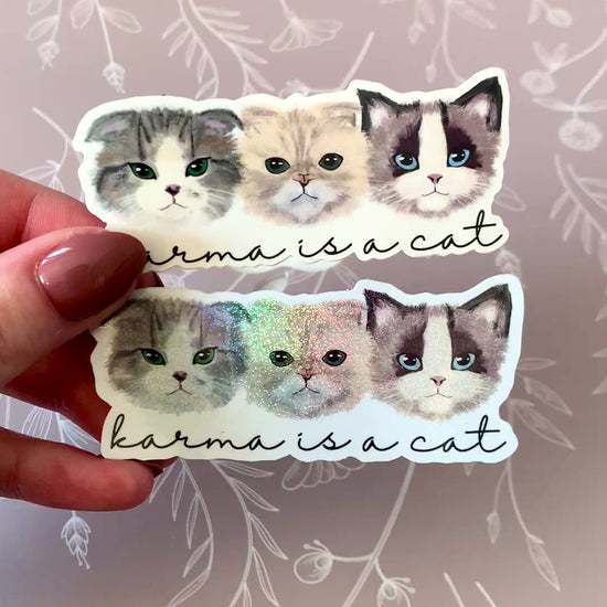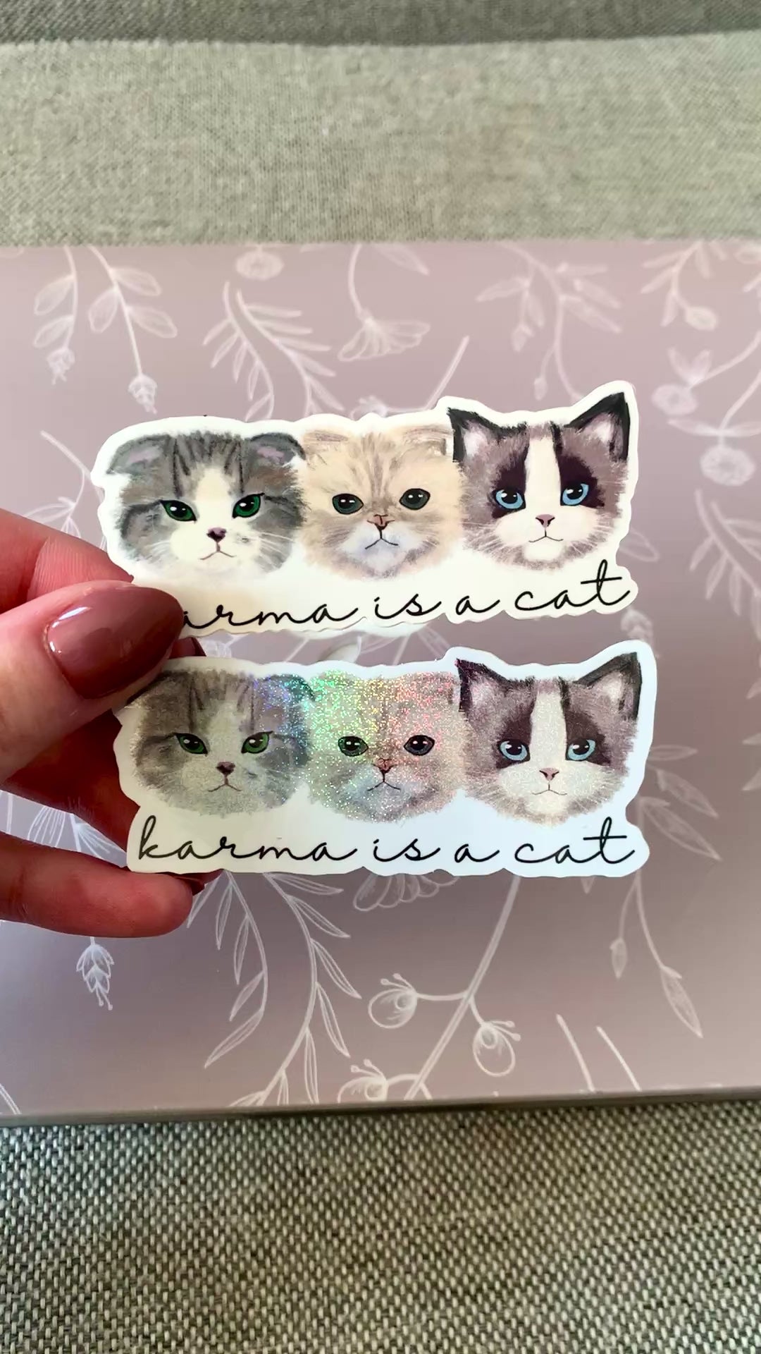 These cute kitty stickers shine bright with stunning detail! Featuring all three of Taylor's famous cats: Meredith, Olivia, and Benjamin, along with a lyric, it is available both in regular and shimmer finishes. (Glitter is sealed by vinyl overlay, it will not transfer.) These stickers look great on a laptop, water bottle, phone case, or wherever makes you happy! These are glossy vinyl stickers, dimensions 3.2" x 1.4". Perfect for music lovers! Listing includes ONE sticker, please choose regular or shimmer from the drop-down menu. Stickers are made to be scratch-proof, weather-proof, and UV-resistant. Wherever you put them, they should stay beautiful for years to come!