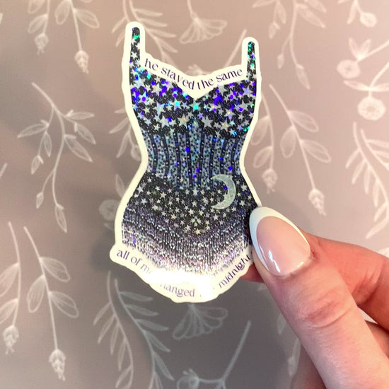 These sparkly Eras moon and stars bodysuit stickers shine bright with gorgeous detail! Featuring a blue and silver rhinestone bodysuit design overlaid with clear glitter, as well as bead fringe and the infamous moon and star details, they sparkle with every color of light. (Glitter is sealed by vinyl overlay, it will not transfer.) These stickers look great on a laptop, water bottle, phone case, or wherever makes you happy! These are glossy vinyl stickers, dimensions 1.9" x 3". Perfect for music lovers! Stickers are made to be scratch-proof, weather-proof, and UV-resistant. Wherever you put them, they should stay beautiful for years to come!