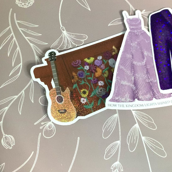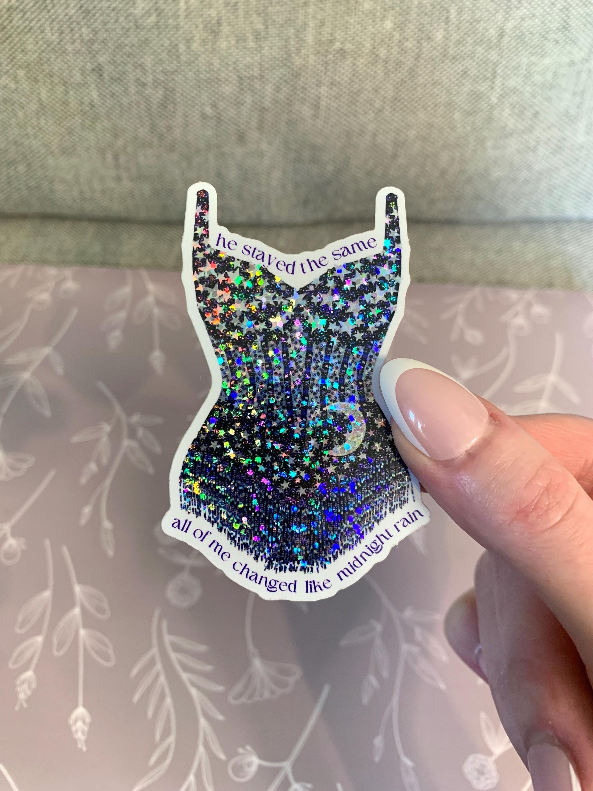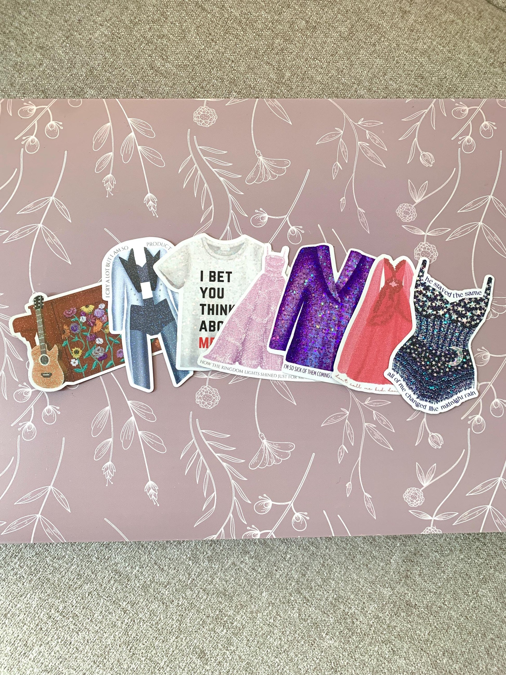 This gorgeous bundle of iconic outfits sparkles with stunning details! Includes seven stickers: the surprise song piano, the silver jacket set, the "I Bet You Think About Me" shirt, the lilac swirls dress, the purple/blue blazer jacket, the berry pink forest dress, and the midnights moon and stars bodysuit, Each sticker sparkles with glitter or shimmer (Glitter is sealed by vinyl overlay, it will not transfer.) These stickers look great on a laptop, water bottle, phone case, or wherever makes you happy! These are glossy vinyl stickers, perfect for music lovers! Stickers are made to be scratch-proof, weather-proof, and UV-resistant. Wherever you put them, they should stay beautiful for years to come!