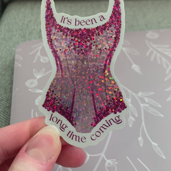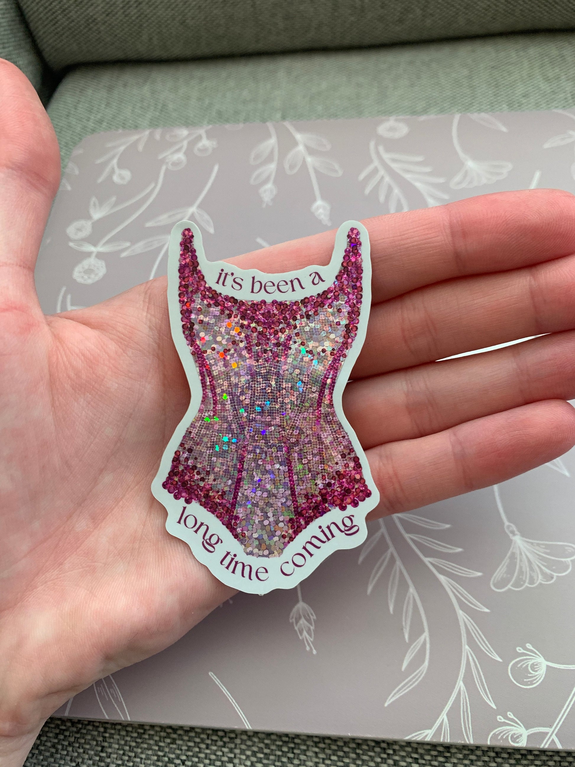 These sparkly pink Eras bodysuit stickers shine bright with gorgeous detail! Featuring a rose and magenta rhinestone bodysuit design overlaid with clear glitter, they sparkle with every color of light. (Glitter is sealed by vinyl overlay, it will not transfer.) These stickers look great on a laptop, water bottle, phone case, or wherever makes you happy! These are glossy vinyl stickers, dimensions 1.9" x 3". Perfect for music lovers! Stickers are made to be scratch-proof, weather-proof, and UV-resistant. Wherever you put them, they should stay beautiful for years to come!