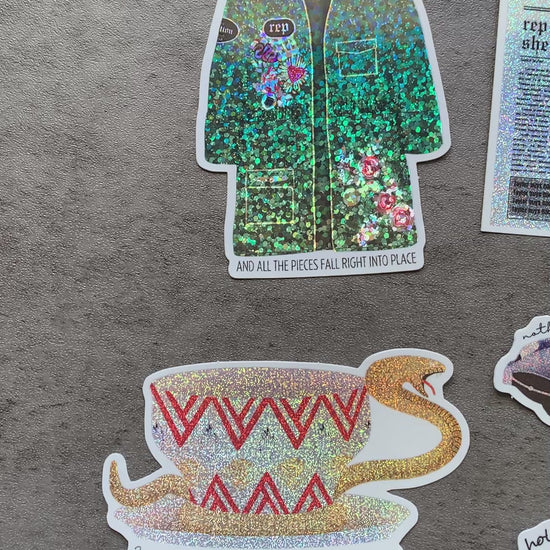 This bundle collection includes 8 stunning stickers: Green Jacket, Newspaper Confetti, Shimmery Dress, Hooded Bodysuit, Snake Teacup, Getaway Car, Charm Bracelet, and Sparkly Diamond Lyric. Each sticker features intricate detail and a subtle shimmer that makes them extra special! These stickers look great on a laptop, water bottle, phone case, or wherever makes you happy! Perfect for music lovers! Stickers are made to be scratch-proof, weather-proof, and UV-resistant. Wherever you put them, they should stay beautiful for years to come!