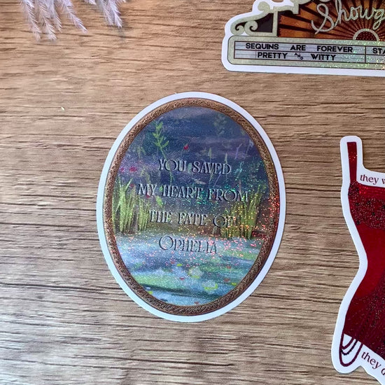 This bundle collection includes 6 stunning stickers: Ophelia Painting, Showgirl Marquee, Burgundy Bodysuit, Pop Star Dress, Backstage Mirror, and Feather Headdress! Each sticker features intricate detail and a subtle shimmer that makes them extra special. These stickers look great on a laptop, water bottle, phone case, or wherever makes you happy! Perfect for music lovers. Stickers are made to be scratch-proof, weather-proof, and UV-resistant. Wherever you put them, they should stay beautiful for years to come!