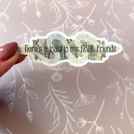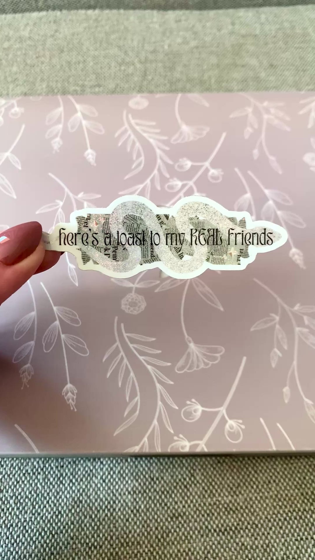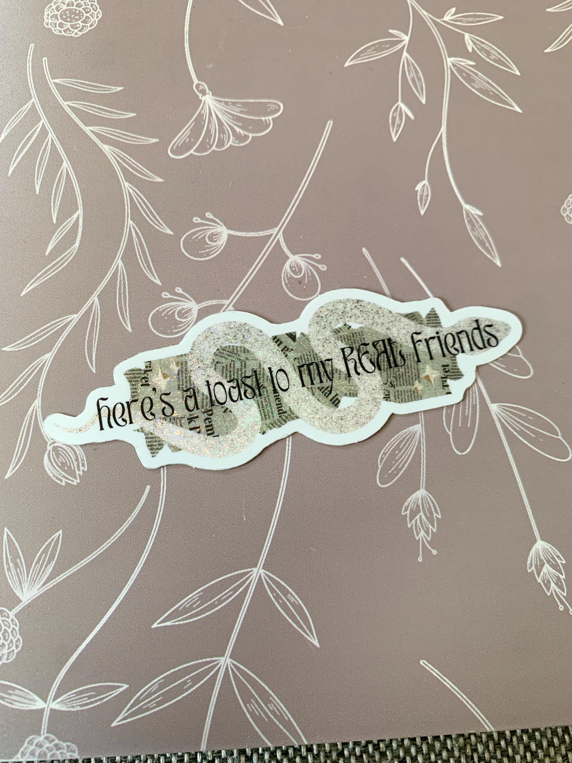 These subtle snake stickers shine bright with stunning detail! Featuring a lyric design with a bejeweled snake and newspaper clippings, it has subtle glitter that shimmers in the light. (Glitter is sealed by vinyl overlay, it will not transfer.) These stickers look great on a laptop, water bottle, phone case, or wherever makes you happy! These are glossy vinyl stickers, dimensions 3.4" x 1.1". Perfect for music lovers! Stickers are made to be scratch-proof, weather-proof, and UV-resistant. Wherever you put them, they should stay beautiful for years to come!