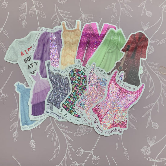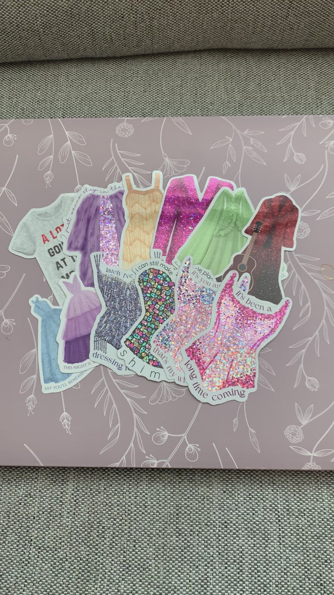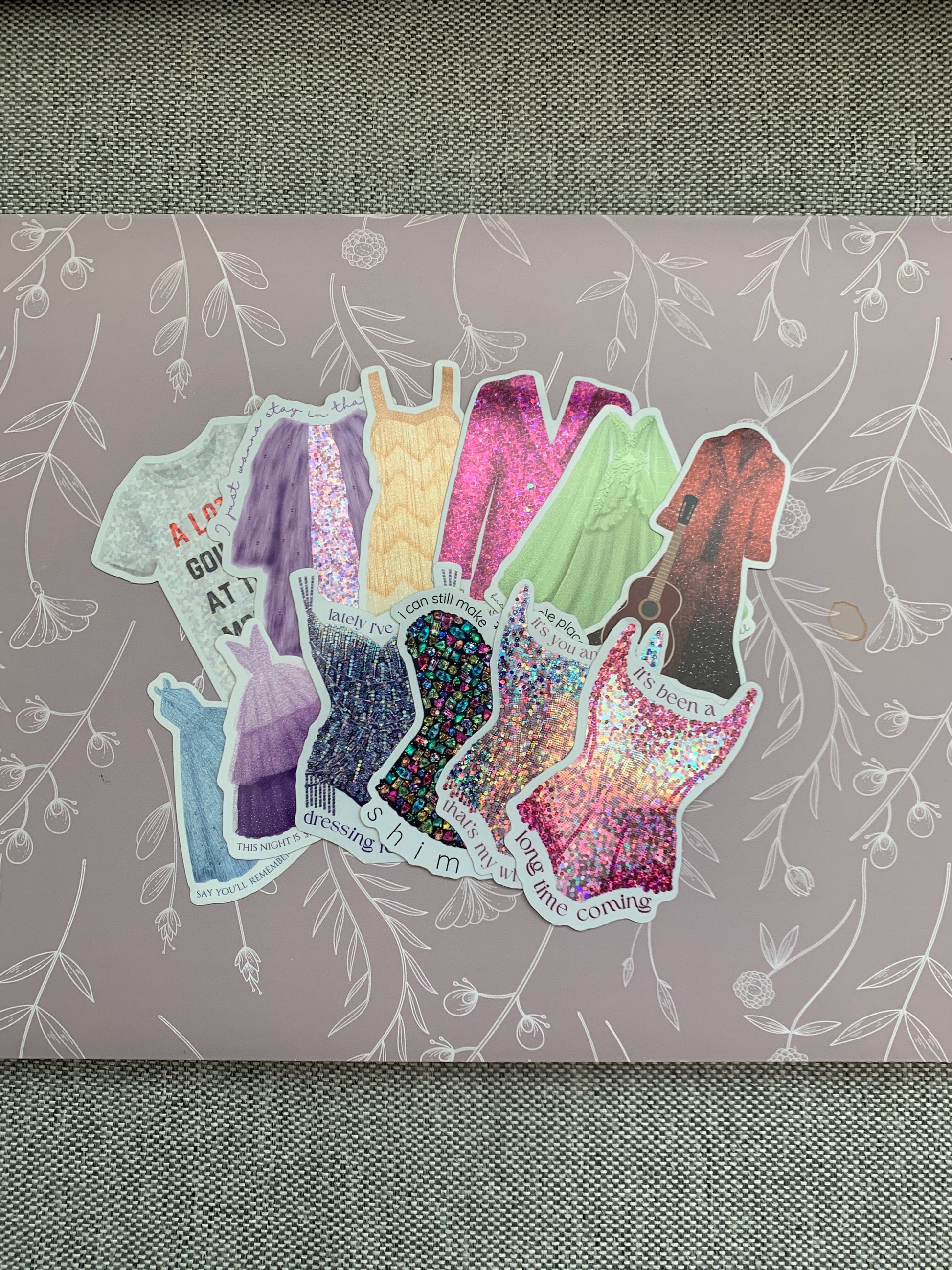 This gorgeous bundle of iconic outfits sparkles with color! Includes twelve stickers: the "A Lot Going on at the Moment" shirt, lavender haze coat, gold fringe dress, Man pink blazer, flowy green August dress, long red and black coat, classic sparkle bodysuit, jeweled bodysuit, dark blue fringe bodysuit, pink sparkle bodysuit, lavender tiered ballgown, and sparkly light blue ballgown.
