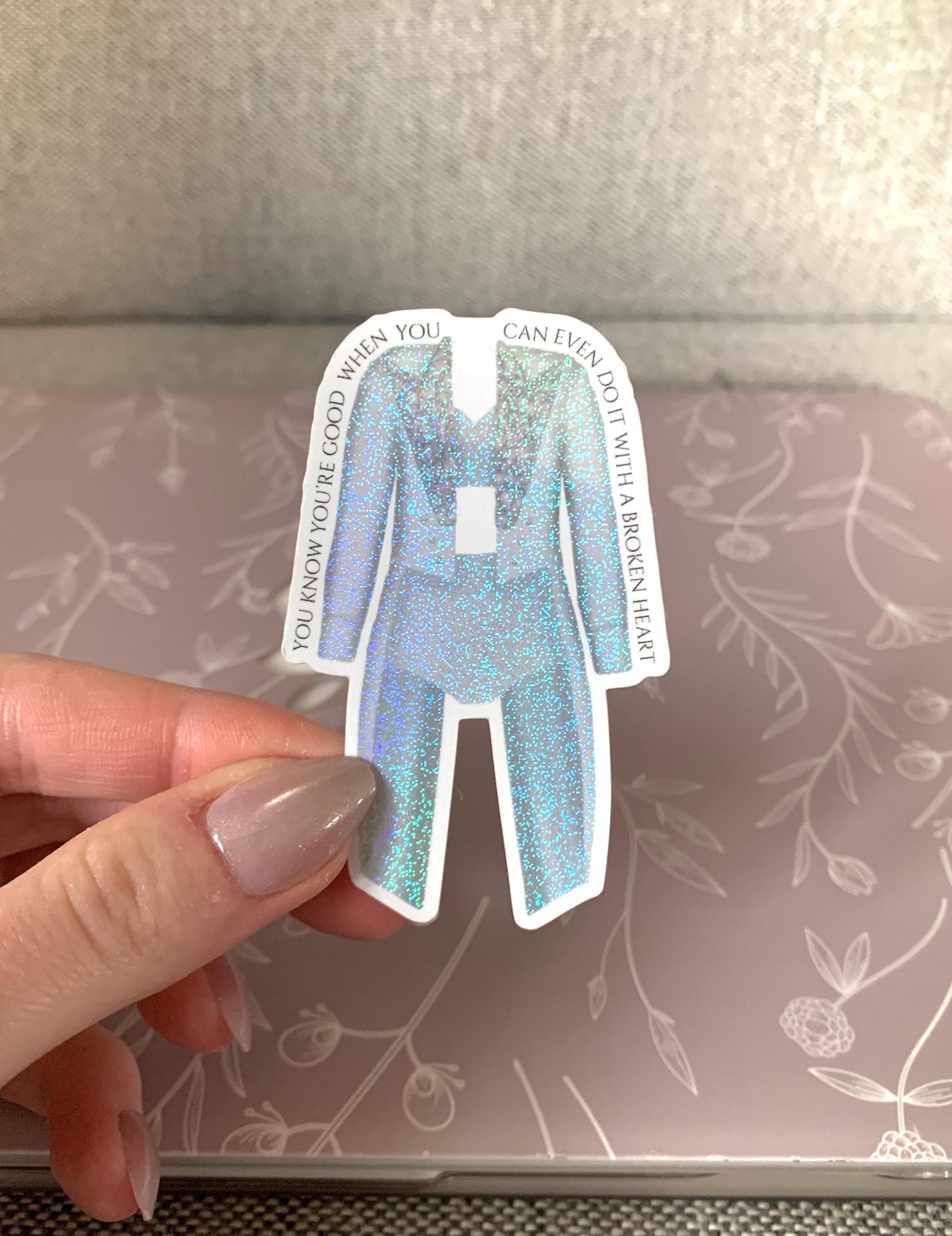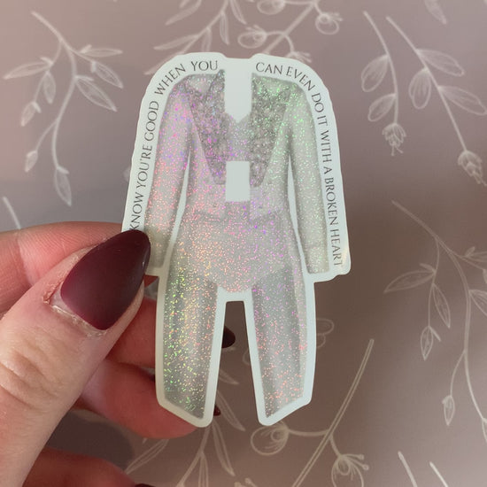 These shimmery Eras white jacket outfit stickers shine bright with stunning detail! Featuring a shiny white and silver coat design overlaid with tiny sparkles, they shimmer with every color of light. (Glitter is sealed by vinyl overlay, it will not transfer.) These stickers look great on a laptop, water bottle, phone case, or wherever makes you happy! These are glossy vinyl stickers, dimensions 1.9" x 2.9". Perfect for music lovers! Stickers are made to be scratch-proof, weather-proof, and UV-resistant. Wherever you put them, they should stay beautiful for years to come!